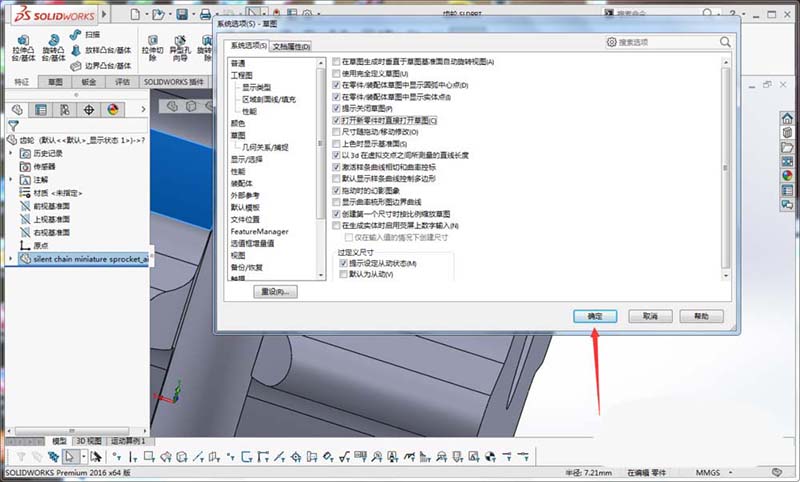 7、我们选中打开新零件时直接打开草图后点击图示的确定就完成设置了,如图所示;