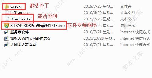 1.在脚本之家下载解压后,大家将获得以下软件:软件安装程序、激活补丁和激活说明,如图