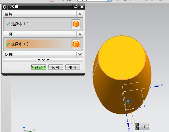 3、由于旋转命令旋转出来的体和拉伸命令拉伸出来的体不是同一部分,因此需要利用求和命令将上述两部分何为一体。