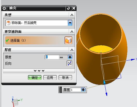 4、利用抽壳命令将杯子内部掏空,杯子厚度根据设计而定。