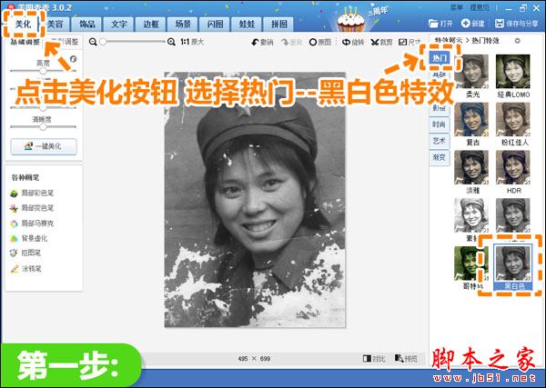 我们需要先打开美图秀秀软件,在“美图秀秀”软件下打开一张待处理的旧照片,在“美化”菜单下,选择“热门”分类下的“黑白色”特效,先调匀照片的颜色。