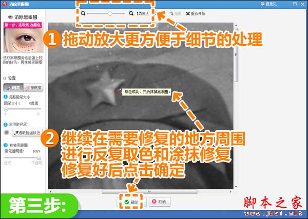 接着我们进入“美容”菜单下,选择“消除黑眼圈”功能,将画笔透明度调至100%,然后用适当大小的画笔在破损处周围取色,再涂抹到破损处进行修复处理。