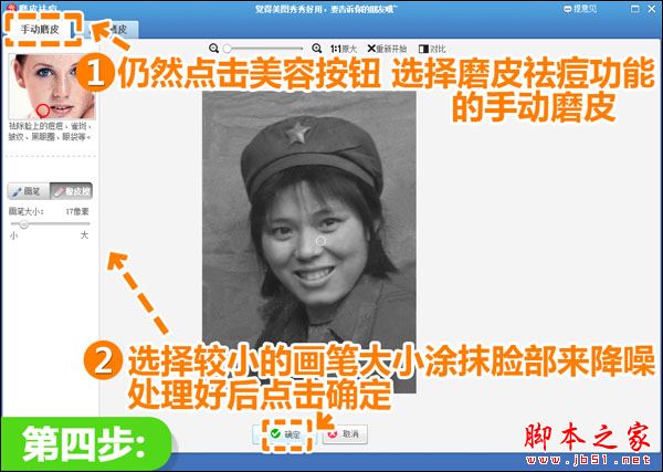 然后还在“美容”菜单下,选择“磨皮祛痘”功能,用手动磨皮来降噪,选择合适大小的画笔涂抹脸部,使肤质更加柔和。