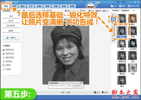 最后我们调节照片的清晰度,在“美化”菜单下,选择“基础—锐化”特效,修复旧照片的工程就大功告成啦!