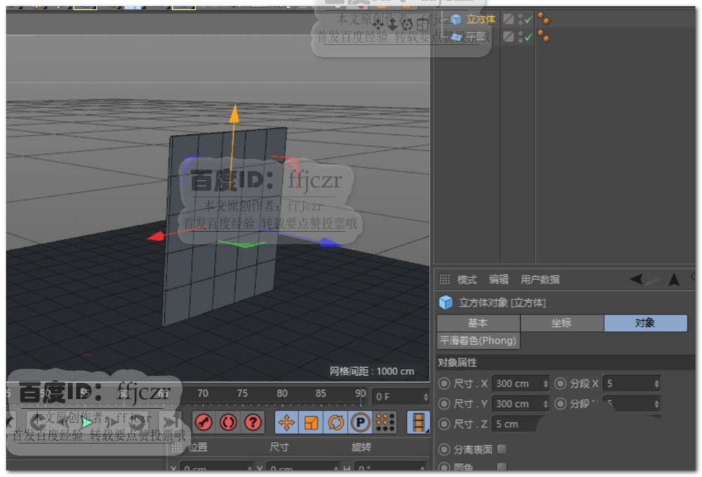 2、创建一个立方体,规格为300*300*5,分段为5*5*1。将立方体调整到略为离开地面。可通过右视来调整,如图所示。