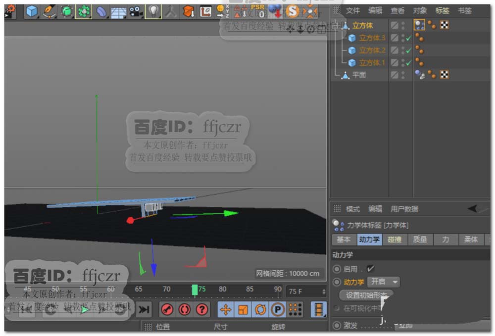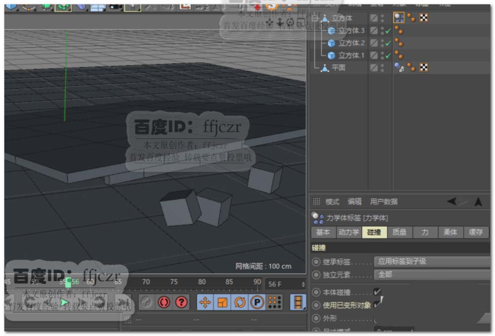 6、选择木板墙的刚体标签,在碰撞项中,更改继承标签为应用标签到子级,独立元素为全部。此时产生碰撞其上承托的三个立方体即产生了散落效果。