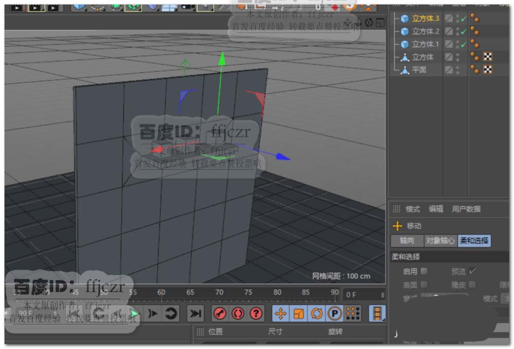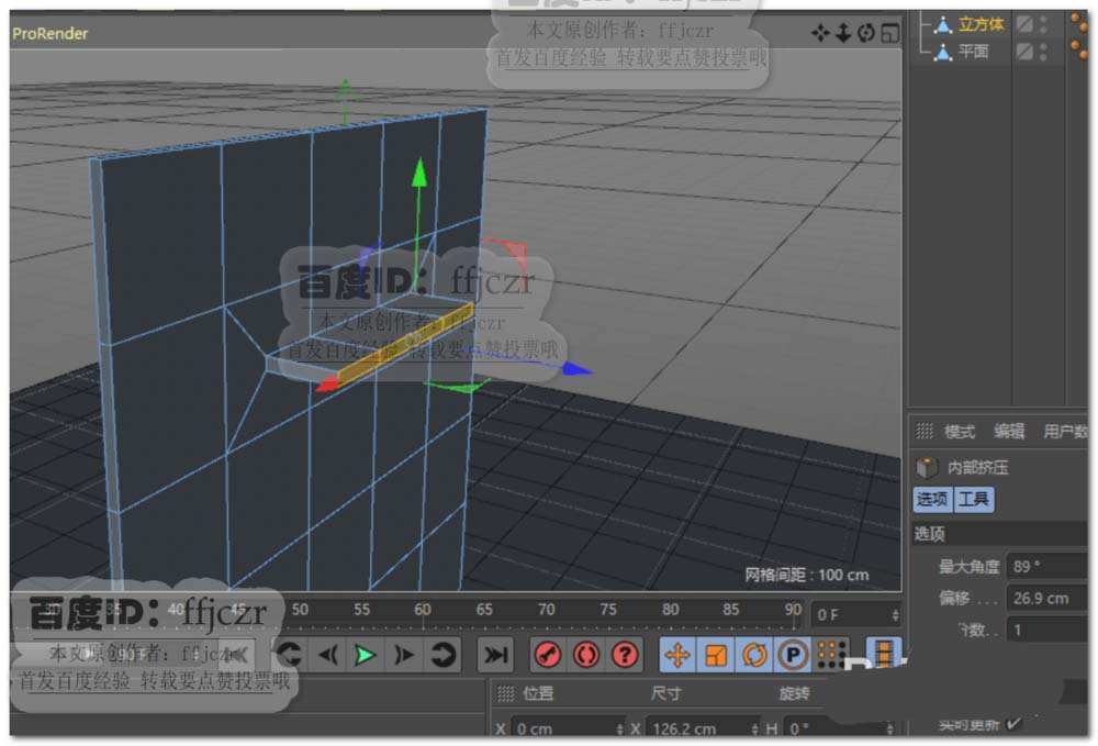 3、将立方体转为可编辑多边形,面模式中选中立方体上的三个结构面(如图所示),通过内部挤压和向外挤压的方式,使立方体表面产生一块承托板。