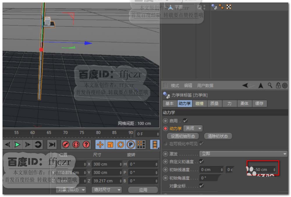7、在没有外力的作用下,点播放木板墙不会动。在木板墙的刚体标签动力学属性中给木板墙定义一个初速度,在Z轴上有一个-50的速度 。这样点播放,木板会因为初速度的作用与地面产生关联。完成动力学的碰撞,木板墙倒下,其上的物品也随之散落。