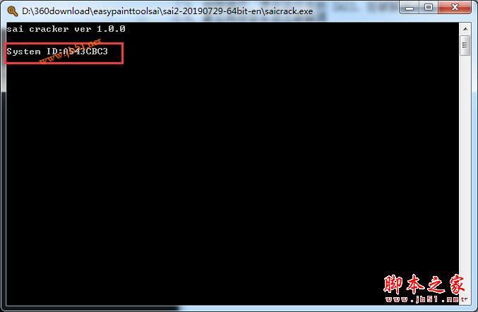 4、运行saicrack.exe,会提示输入系统ID,把在SAI2中显示的系统ID输入到破解器中,回车(英文必须大写,必须是本机ID)