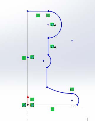 5、添加几何约束关系:两个长度为40的直线均为竖直直线、R20的圆弧端点及圆心竖直、下面长度为40的直线与R60的圆弧相切、R60的圆弧与R12.5的圆弧相切。注意:约束不可重复定义。如图2-3c所示。