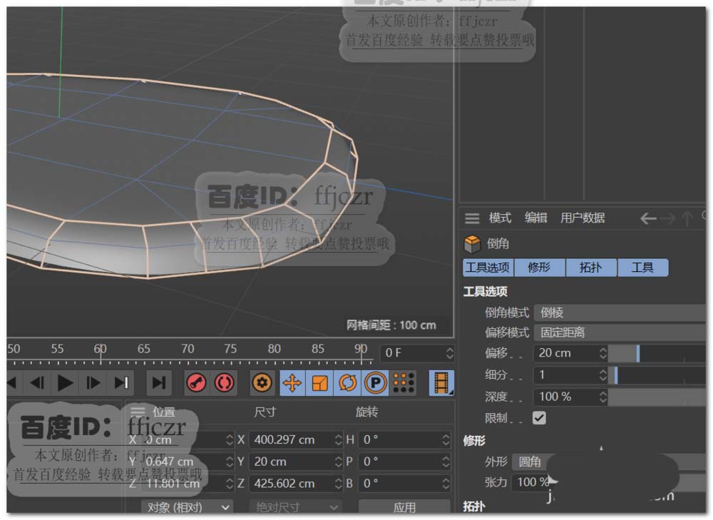 4、给调整后的多边形添加合理的结构线;选中多边形的上表面轮廓边,进行倒棱角,偏移值为20,细分为1(倒角要勾选限制)。