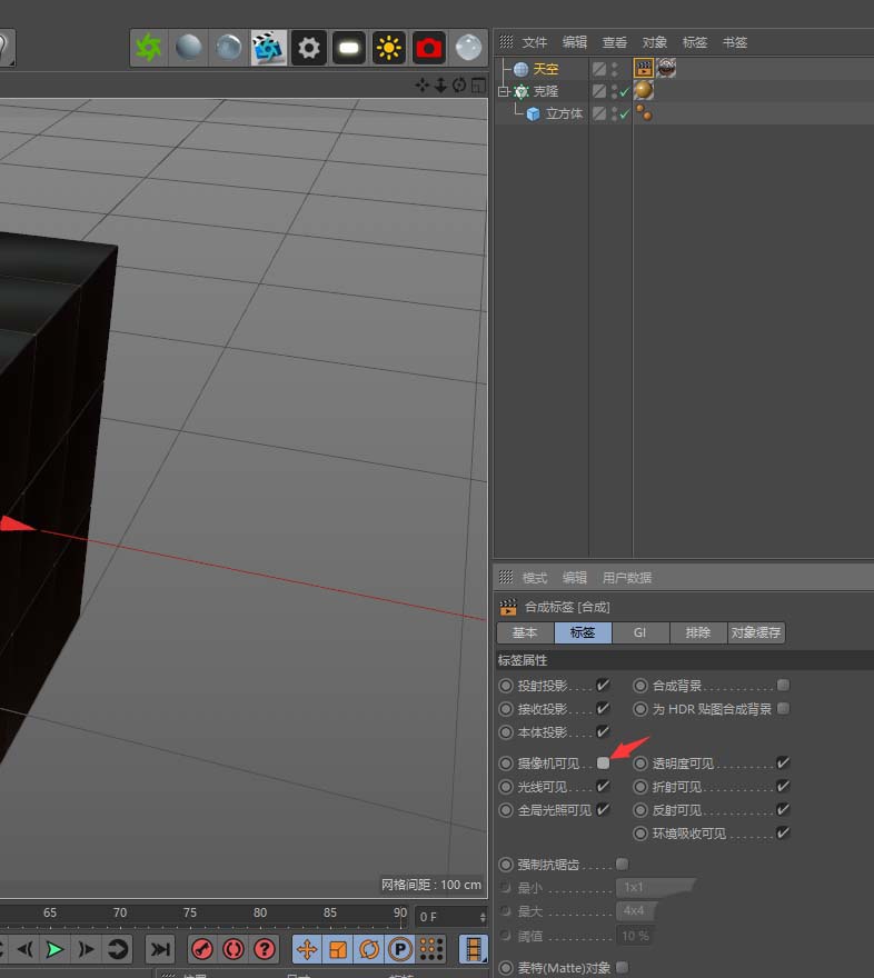 6、给天空一个合成标签。去掉摄像机可见,这样渲染就看不到天空了