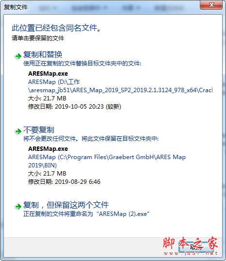 5.复制安装包中的"ARESMap.exe"到软件安装目录中,软件安装目录为"C:\Program Files\Graebert GmbH\ARES Map 2019\BIN",选择复制和替换