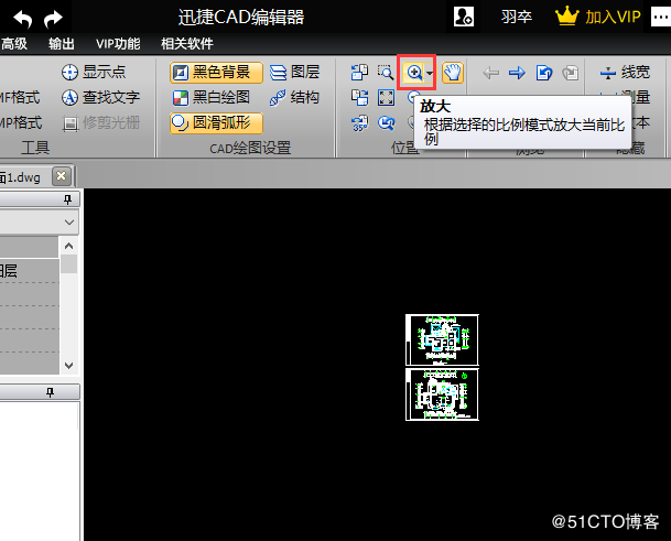 步骤三:CAD图纸进行打开后,就发现图纸查看不清楚。此时就需要将该软件上方的菜单栏选项切换到“查看器”中,之后在位置栏中在点击“放大”选项按钮。更加选择的比例放大当前比例。