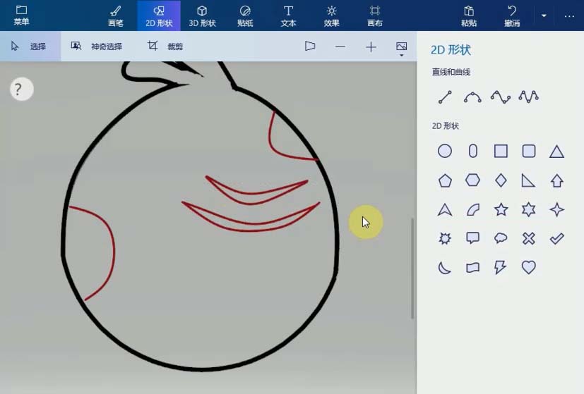 1、打开画图3D程序,选择菜单上的2D形状,单击圆形工具,画一个大的圆形,然后用两条五点曲线画出蛋形圆,擦掉多余的线条,作为大红鸟的身体。