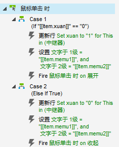 如果xuan=0,更新行this,列xuan=1。设置文本1级文本标签=memu1,2级文本标签=memu2,出发鼠标单击展开按钮。