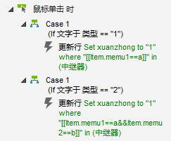 如果type文本标签=2,更新行条件[[Item.memu1==a&&Item.memu2==b]],更新xuanzhong=0。更新行条件[[Item.memu1==a&&Item.memu2==''&&Item.memu3=='']],更新xuanzhong=0
