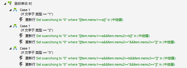 如果type文本标签=3,更新行条件[[Item.memu1==a&&Item.memu2==b&&Item.memu3=='']],更新xuanzhong=0。更新行条件[[[Item.memu1==a&&Item.memu2==''&&Item.memu3=='']],更新xuanzhong=0