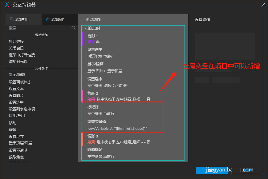 5、以加入右侧按钮为例,我们要实现点击时删除数据并移动该条选中数据至右中继器,删除数据的效果前面我们已经做了,接下来是在点击加入右侧按钮在右中继器新增行。这个时候我们需要用到全局变量,将需要右移的数据存储进去,然后使右中继器获取数据