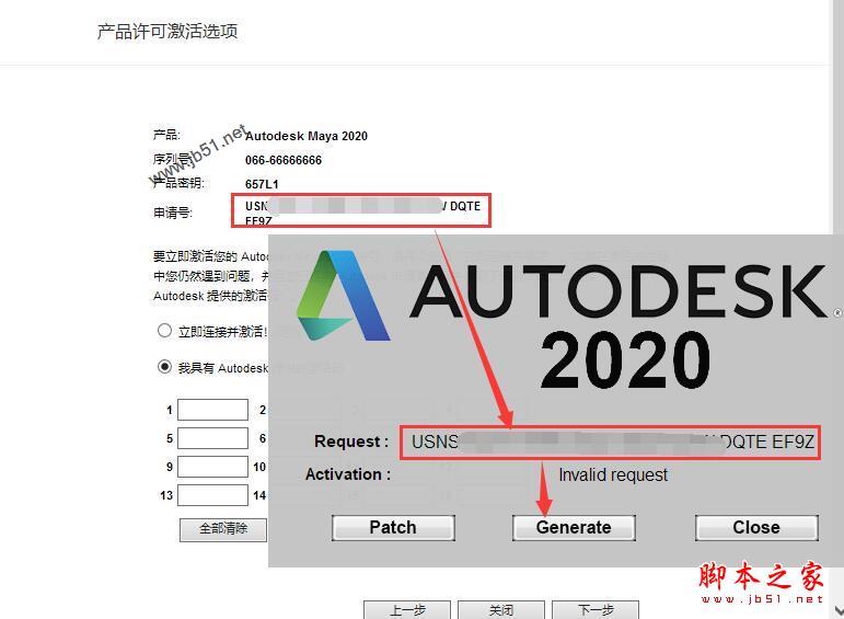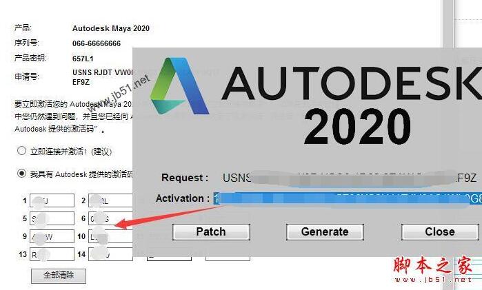 13、将申请码复制到注册机request中,点击generate它会计算出激活码