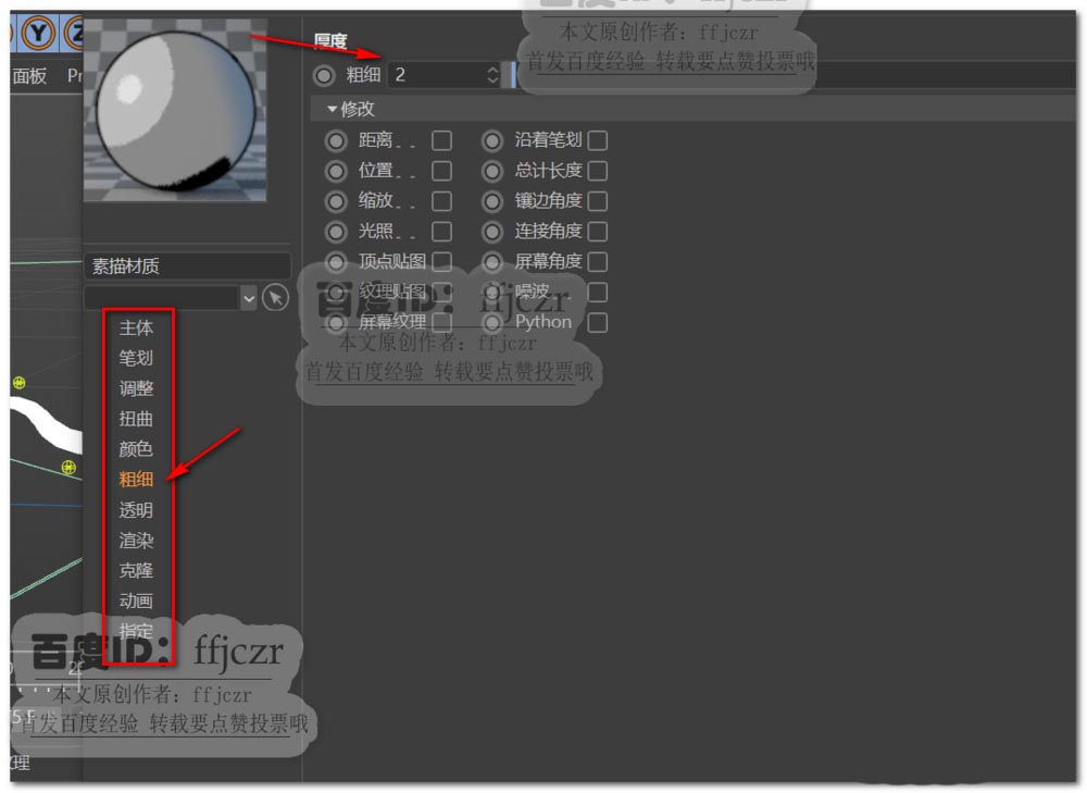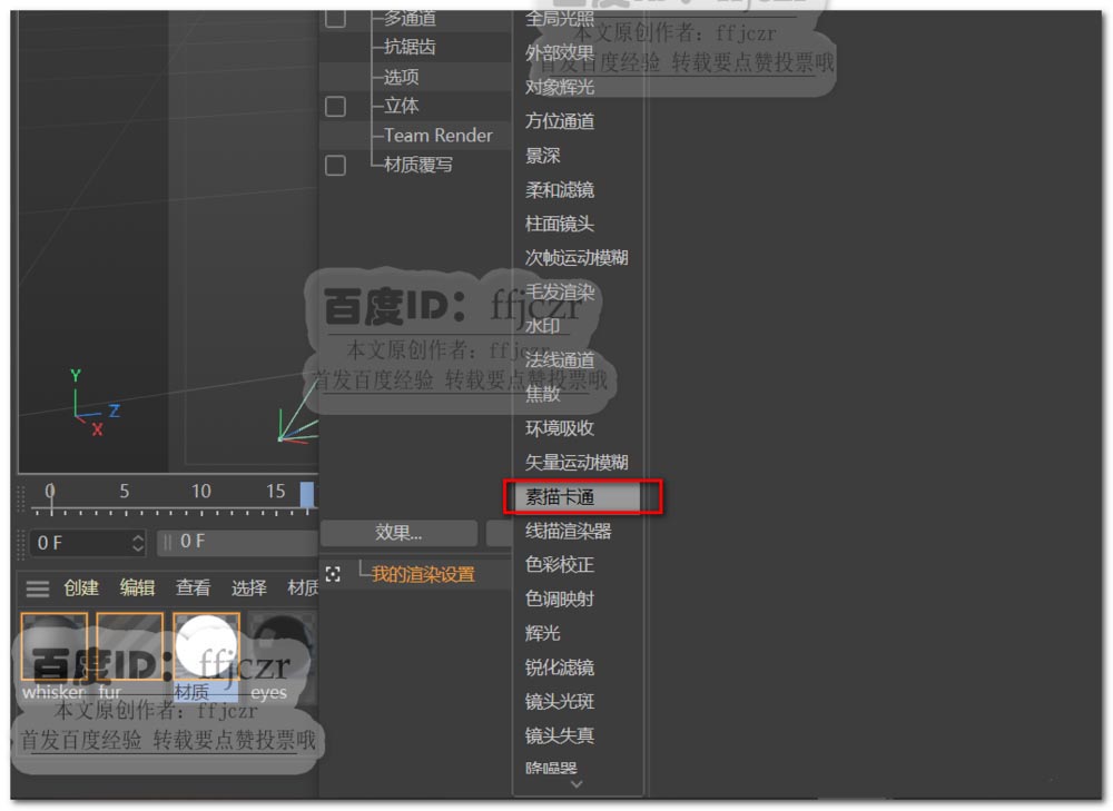 6、添加了素描卡通项后,在材质栏会添加一个专属的素描材质,可以点开这材质球,在编辑器中更改其中的参数。这里点开粗细通道,将粗细值更改为1.5。再次渲染,即可得到所要的线稿图。这样通过调整不同的视角进行渲染即可得到不同视角下的二维线稿,这样比手工绘画快多了吧?