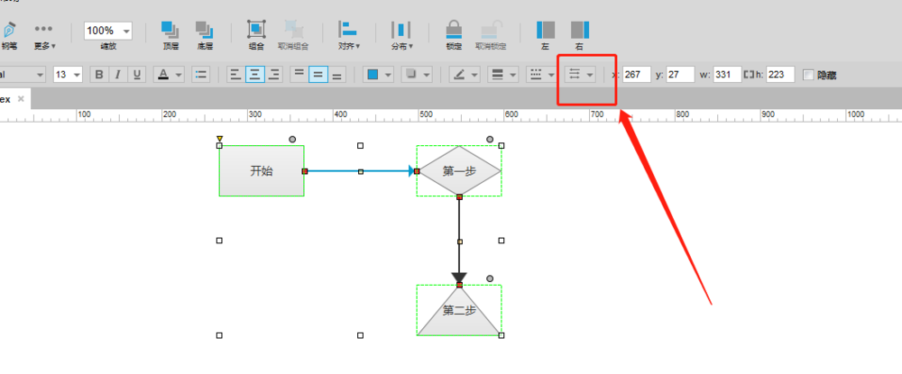 3、连接成功后,这个时候我们发现,是没有箭头的,一般流程图都需要有箭头,这个时候我们选择箭头工具,需要给对象添加箭头(如下图)。