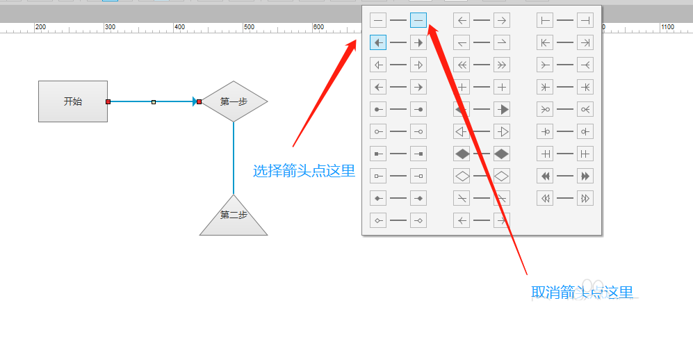 4、选择箭头后,有一点需要注意,Axure箭头工具虽然提供很多的类型,但是取消箭头,但是整体来说不是很友好,需要单独点击,上方的横线(如下图)。