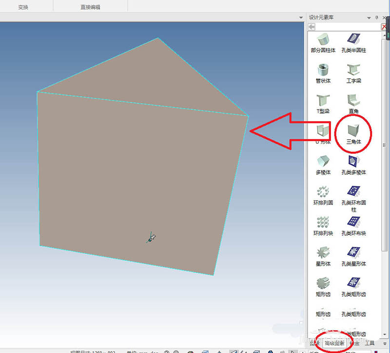 2、如下所示,从右边的设计元素库中的高级图素中找到“三角体”,将它拖动到三维空间释放,就这样快速创建一个三棱柱。