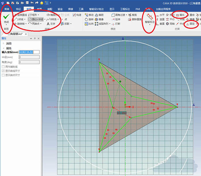 5、如下所示,进入草图,激活连续直线命令,以实体的端点为起点画一个封闭的三个尖角的图形,然后添加几何约束,三个端点固定,六个边线等长,然后激活智能尺寸命令,标注一个大概的尺寸,看着效果,这里我标注的是宽度12,然后别忘了激活圆命令,以坐标原点为圆心画一个圆,这个圆要将刚刚约束的图形包含在内,最后才可以点击完成,退出草图。