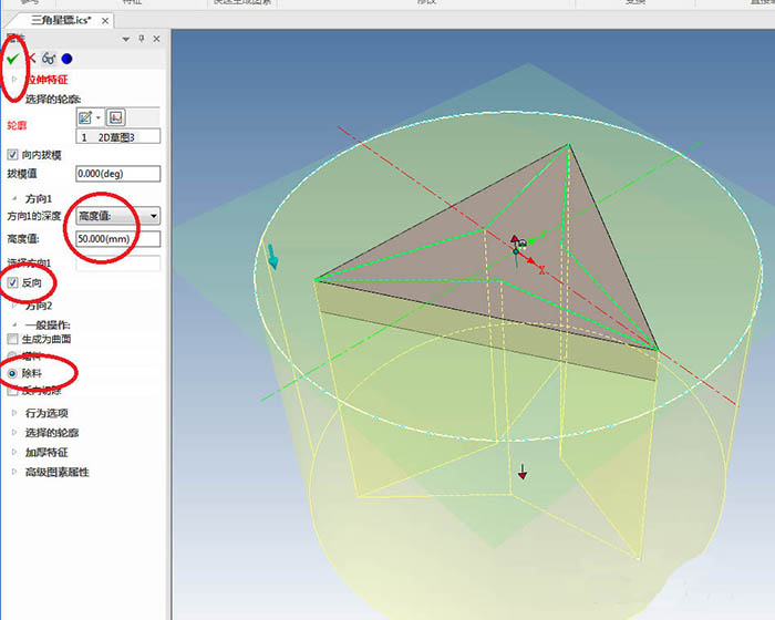 6、如下所示,退出草图,回到拉伸特征属性栏,看着预览效果,决定是否点击“反向”,然后点击“除料”,设置高度超过实体即可,最后点击√,完成并应用。