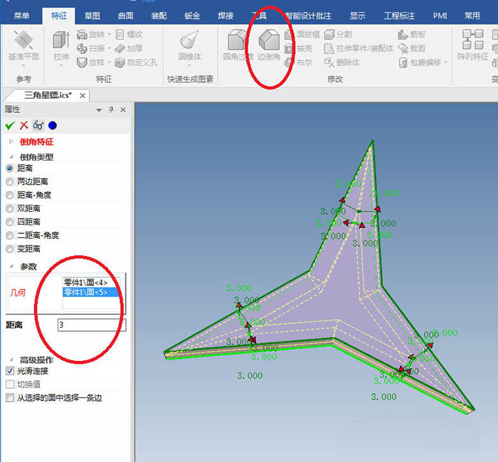 7、如下所示,一个三角星柱体出现了,首先,点击特征工具栏中的“边倒角”命令,然后看属性栏,默认倒角类型为“距离”,、我们选择柱体的上下表面,然后设置距离为3,点击√。
