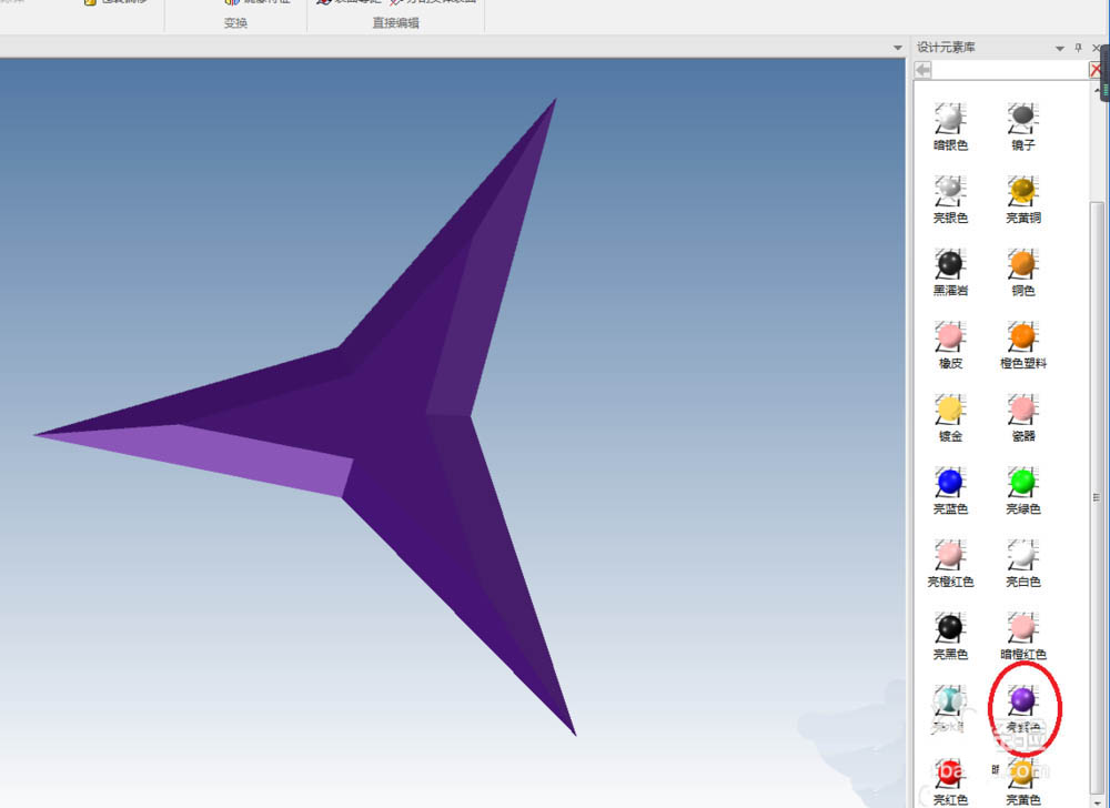 8、如下所示,在设计元素库中找到一种颜色,(这里我找到的是亮紫色),将这种颜色拖到实体上释放,然后见显示改成“真实感图”,最后的效果就是下图所示的了,亮紫色三角星镖。