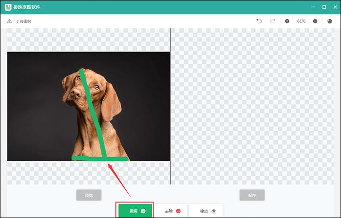 点击页面中的“保留”,在图片中利用绿色线条标记想要保留的图片区域就可以了。如果需要抠的图片区域不是很规整,可以点击“保留”多添加几个绿色标记。