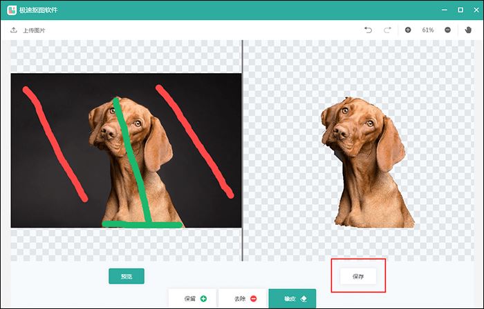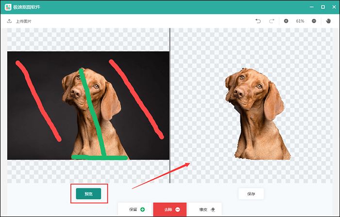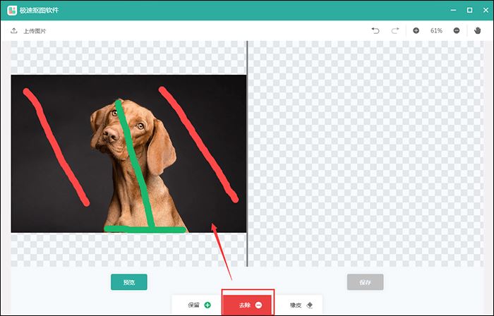 接着点击页面中的“去除”,然后在图片中利用红色线条标记需要去除的区域就可以了。小编建议大家根据需要抠的图片区域做红色线条标记,这样可以抠的更准确。