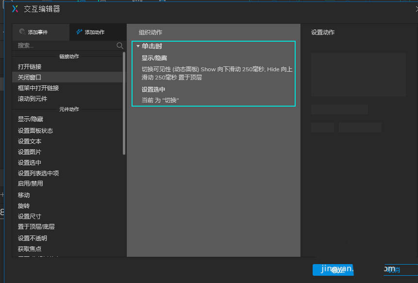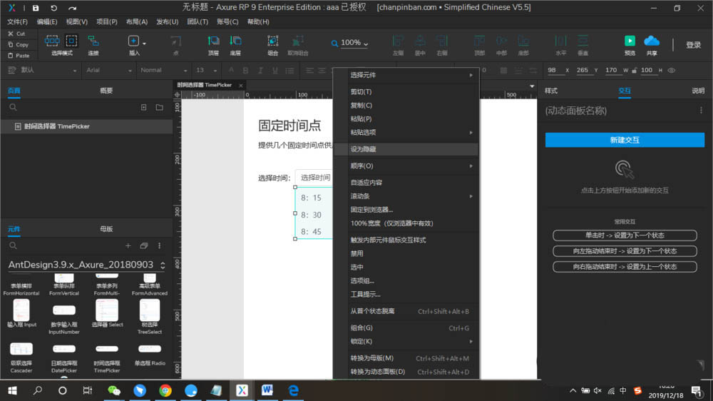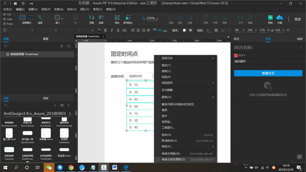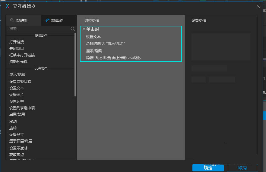 3)双击进入动态面板,在每一个时间选项的矩形框,设计单击交互事件,即选中时时间选择框的文本值为当前时间选项的文本,如下图以8:15的为例设置为即可预览效果。