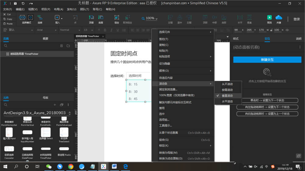 4、接着要实现选择时间时的滚动效果,选择动态面板然后右键选择滚动条-垂直滚动。