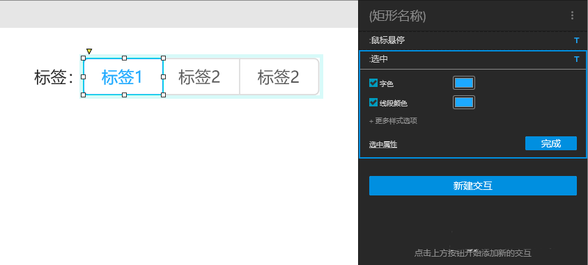 1、以三个标签为例,拖动三个矩形框作为标签1、标签2、标签3。设置悬停效果字体为浅蓝色,选中效果为字体为浅蓝色,线段为浅蓝色