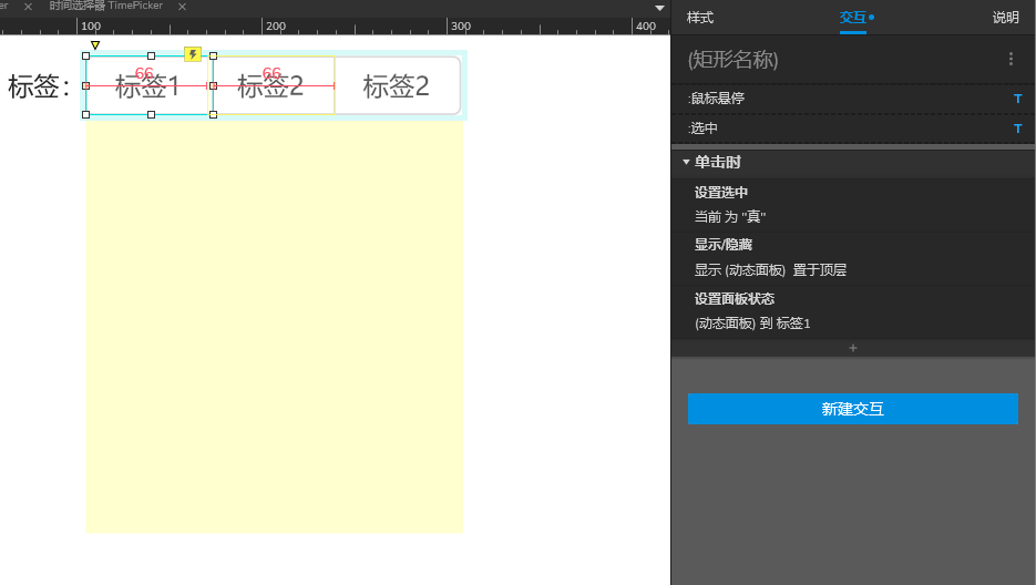 7、设置交互事件,以标签1为例,单击时显示动态面板,状态为标签1,矩形为选中状态,标签2、标签3同理,单击时显示动态面板,状态为对应状态,对应矩形为选中状态