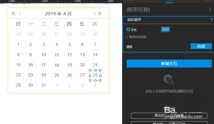1、首先我们在Axure中拖动一个矩形作为日期选择呈现,命名为日期选择框,并按需设计效果,这里我设计悬停及选中为浅蓝色