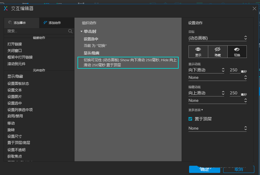 6、在日期选择框中设计事件交互,当点击时切换显示动态面板并向下滑动、隐藏动态面板并向上滑动。如图