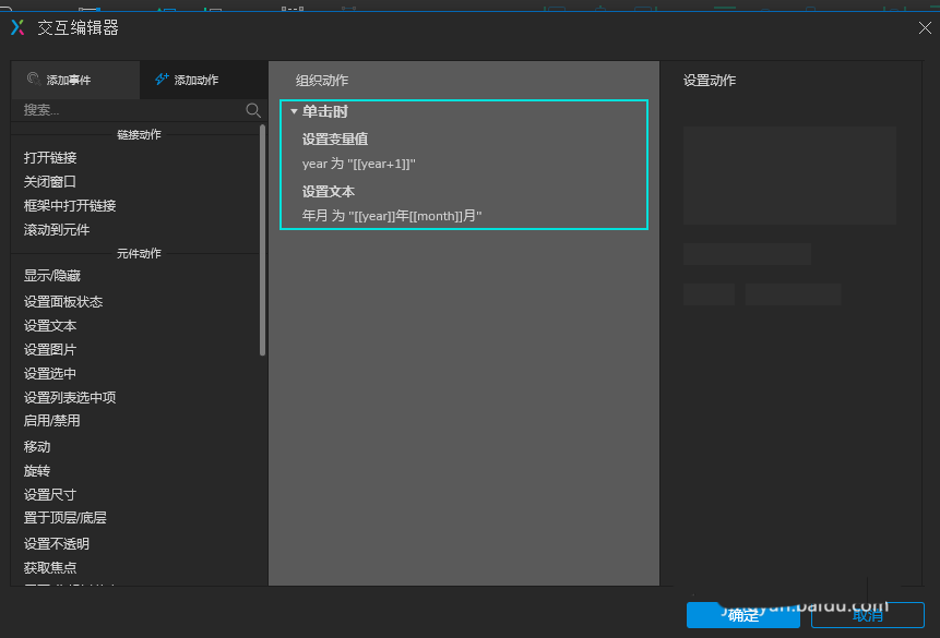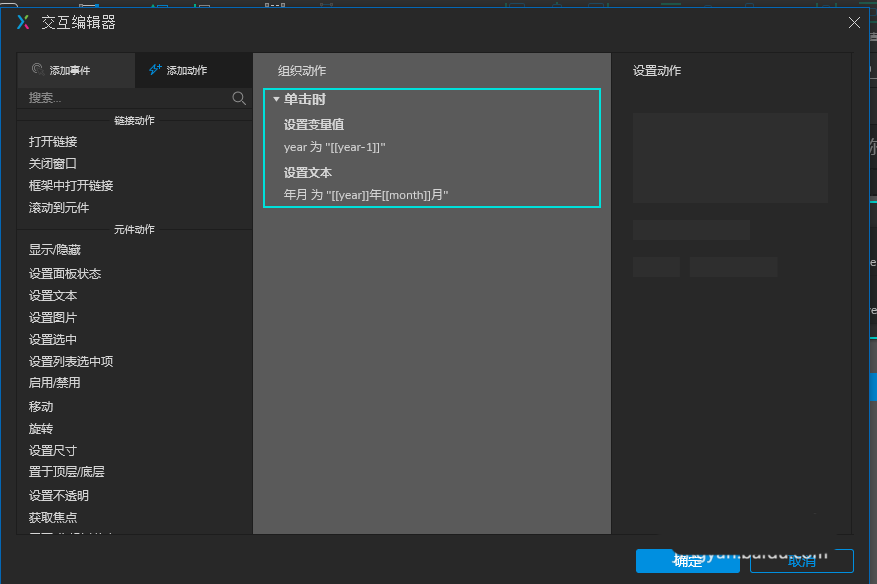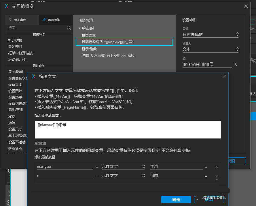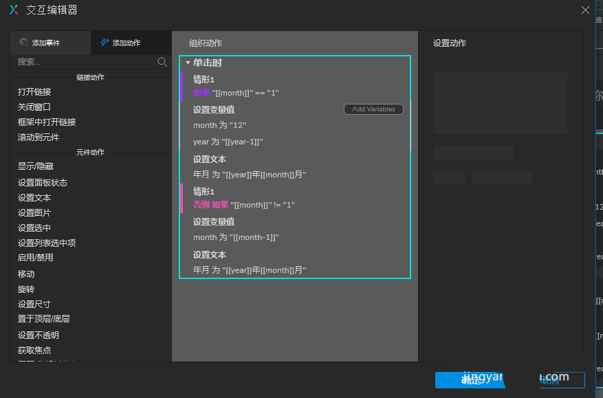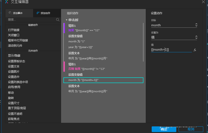 13、关于箭头《的逻辑比较简单,点击时全局变量year-1即可,最后再设置关于年月的文本值为year年month月。箭头》同理,点击时全局变量year+1即可,最后再设置关于年月的文本值为year年month月。如下图