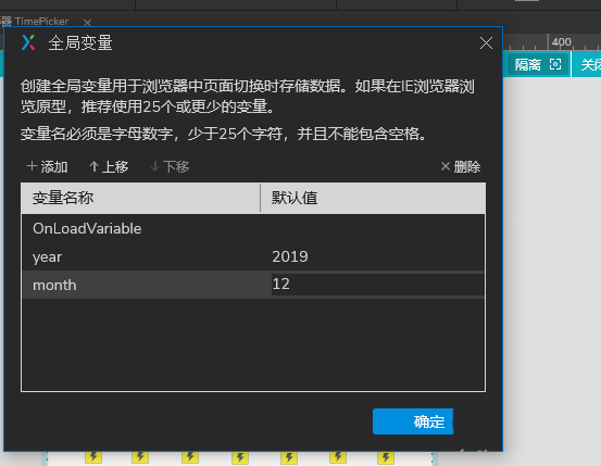 10、回到年月的矩形框,我们先新建两个全局变量,一个作为年,一个作为月,然后默认年为2019,月默认为12。