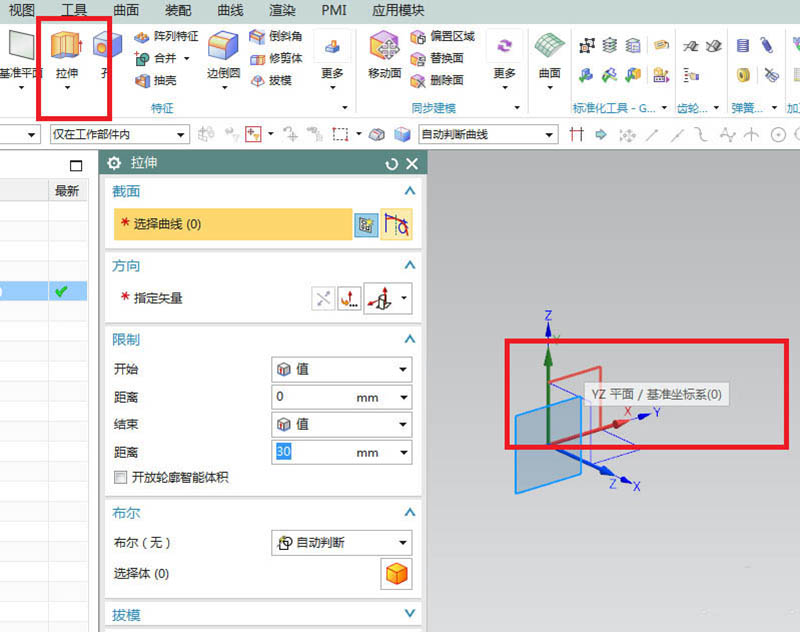 2、如下图所示,点击工具栏中的拉伸图标,激活拉伸命令,然后点击基准坐标系中的YZ平面,直接进入草图。