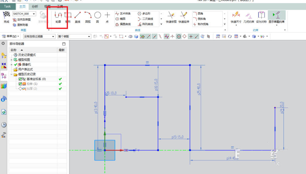 3、如下图所示,进入草图之后,我们自动激活了“轮廓”命令,然后随意画一个下图中的回形,然后激活工具栏中的几何约束命令,添加相等、共线、平行等约束,然后激活快速尺寸命令,标注尺寸,不会标注的可以参照下图中的尺寸标注,最后点击完成,退出草图。