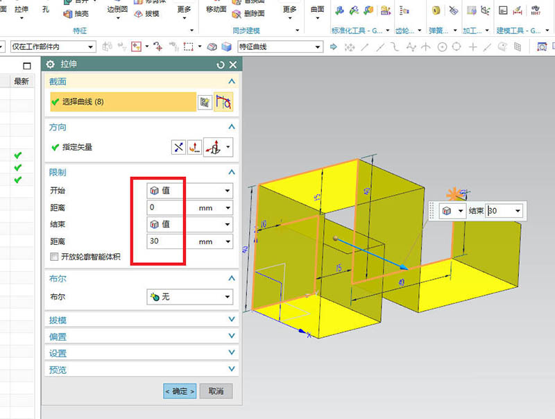 4、如下图所示,退出草图之后,回到拉伸对话框,因为草图不是封闭的,所以从拉伸预览的效果可以得知这是个片体,设置距离从0开始,30结束,点击确定。