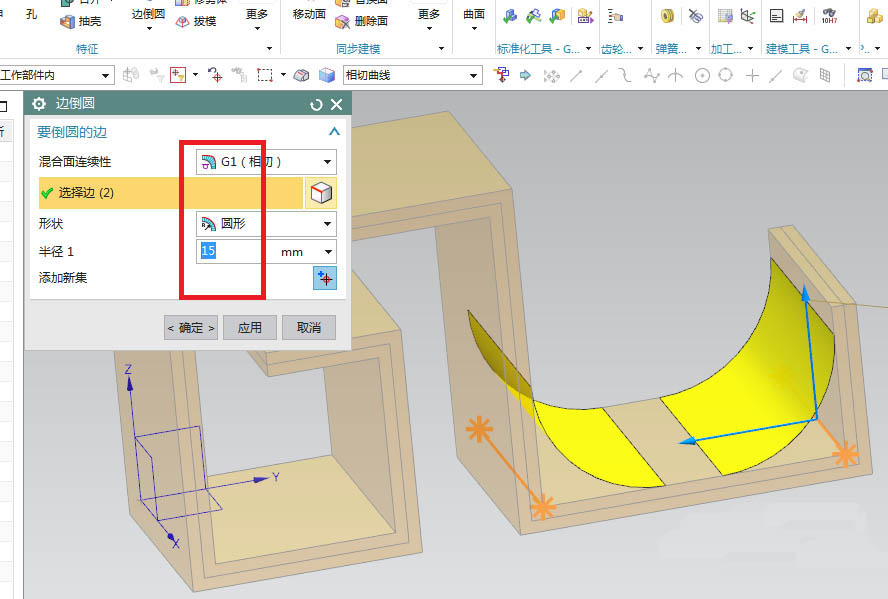 6、如下图所示,点击工具栏中的“边倒圆”命令,在“边倒圆”对话框中设置半径1为15,在实体上选择两条实体边线,点击应用。完成第一次边倒圆操作。