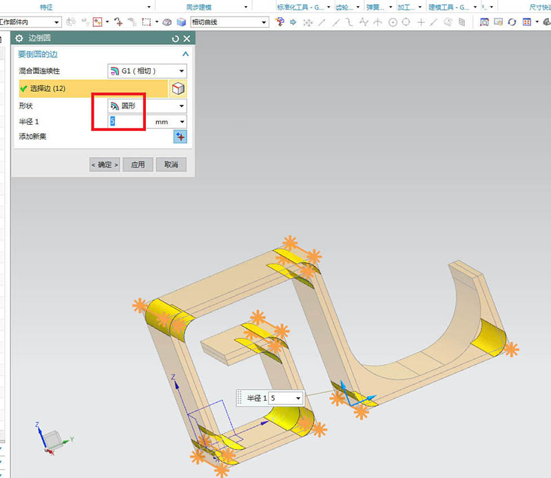7、如下图所示,第二次边倒圆,看着这些边线,选中他们,然后设置半径1为5,单击“应用”。