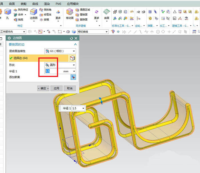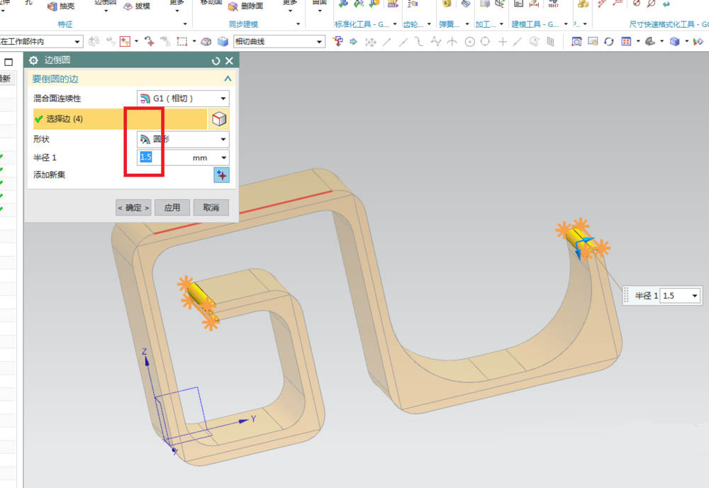 8、如下图所示,第三次边倒圆,只要四条边,半径1设置为1.5,点击“应用”。