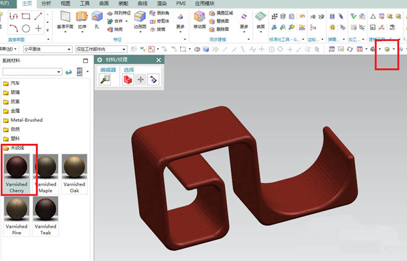 11、如下图所示,先将显示改成艺术外观,然后【菜单——视图——可视化——材料/纹理——木纹线】,找到一种想要的木纹线指定给实体,最后的效果就如下图所示了。