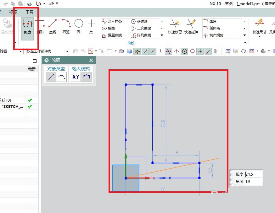 3、如下图所示,进入草图,自动激活轮廓命令,然后以坐标原点为起点和终点,画一个空心的L形状,尺寸无所谓。